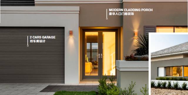 入户门廊,采用高配版Feature Wall, 并打造出大面积欧洲风格的前院,花园走道和户外的石板地面营造出气派奢华的观感。