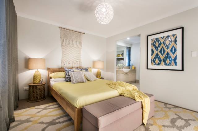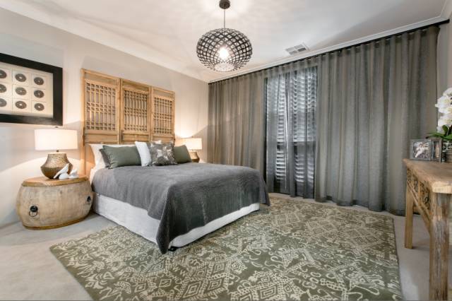同样,设计师为主卧也设计了整面墙的落地窗,大型衣帽间,中央空调独立端口,全套Corroma独立卫浴,并铺设了澳洲羊毛地毯(可升级为木地板),为主人营造了舒适浪漫而又私密的氛围。