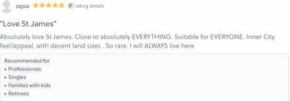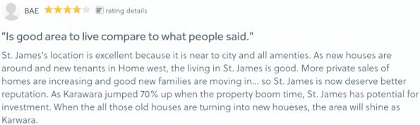 一位名为zajsia的网友说“大爱St James区,绝对的!几乎靠近一切生活必须品,适合所有人,像城区一样便利,土地大小正好,类似的区域非常稀少,我会一直住在这里!”