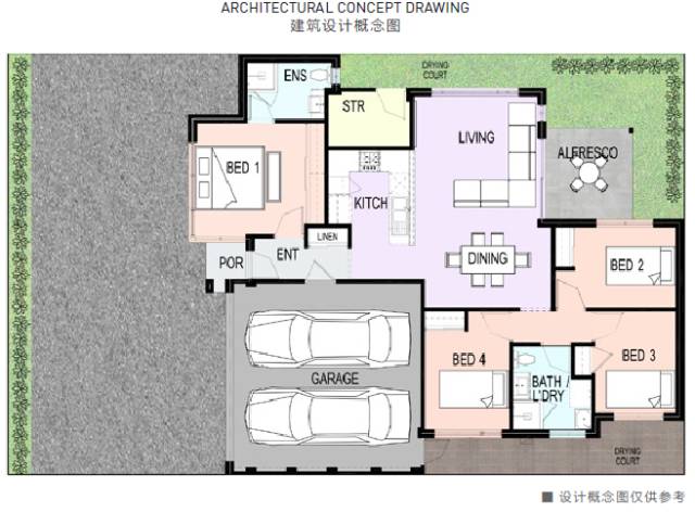 每套别墅拥有245-272平方米不等的永久土地产权,在符合澳洲最高6 Star效能标准的基础上,澳洲和中国两国的设计师精心打造出4房2卫2车库及3房2卫2车库的经典别墅户型供客户选择。考虑到购房者不同的需求,我们也可将4房户型中的第四个房间设计为正对前院景观的独立书房。