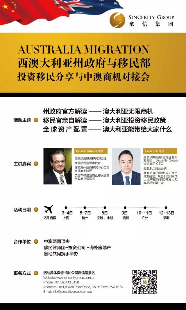 今天就为想要了解关于澳大利亚移民的最新官方消息和动态的朋友们带来一则好消息!西澳州政府将于12月3日-13日携手Sincerity Group籴信集团登陆中国七大城市,与大家分享最官方、最准确的澳洲投资移民政策,把握最前沿的中澳合作商机。